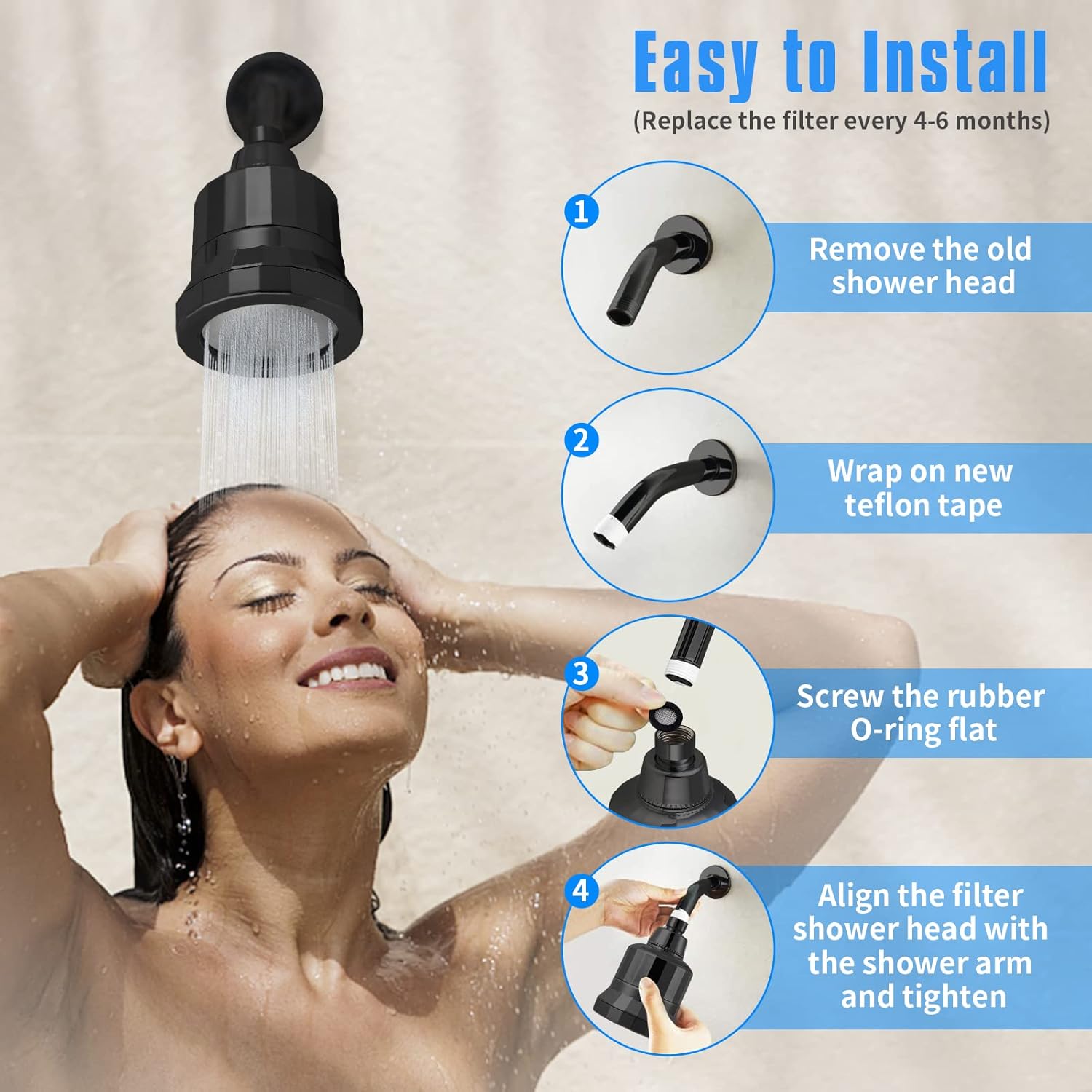 Der 15-stufige Filterduschkopf ist einfach zu installieren. Normalerweise können Sie ihn ohne Spezialwerkzeug an Ihren vorhandenen Duscharm anschrauben. Beachten Sie die detaillierte Installationsanleitung in der beiliegenden Bedienungsanleitung.